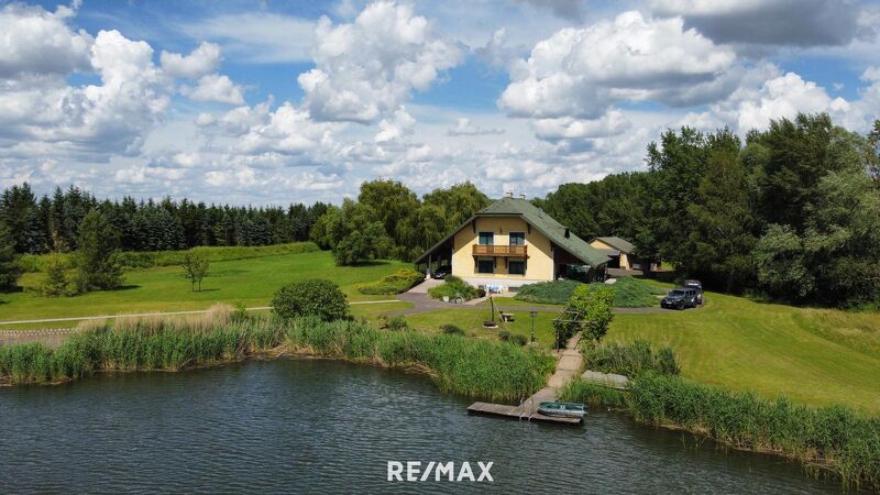Das Haus mit einer Wohnfläche von 193 m² wurde im Jahr 1999 gebaut und bietet sehr viel Platz für die ganze Familie oder auch zur Vermietung für Feriengäste. Im Erdgeschoß befinden sich eine offene Küche und das Wohnzimmer, für deren behagliche Wärme im Winter ein Kachelofen sorgt. Auch gibt es im Erdgeschoß ein Zimmer, welches als Gästezimmer oder Büro genutzt werden könnte. Weiters gibt es 2 Badezimmer und 2 WCs, je eines im Erdgeschoß und eines im Obergeschoß. Das Obergeschoß verfügt weiters über 5 Zimmer, teilweise mit Balkon und Blick auf den eigenen See.
