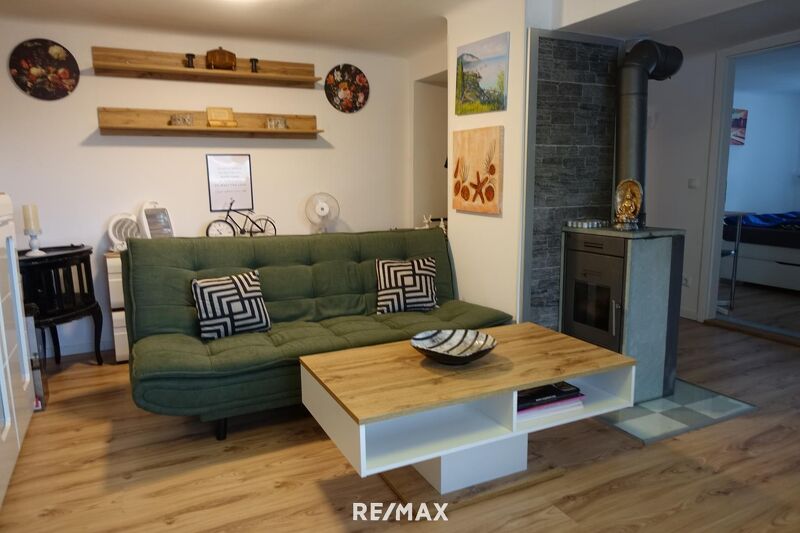Wohnzimmer mit gemütlicher Sitzecke und Kaminofen